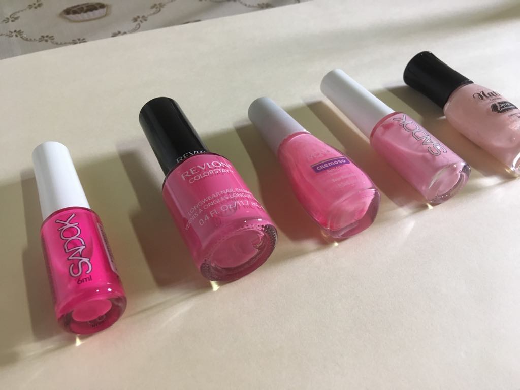 Comecei por esse da Sadok, é a cor Rosa mesmo e fica um rosa bem forte, no primeiro dedo. Decidi colocar as cores mais fortes e indo para as mais claras começando pelo mindinho.